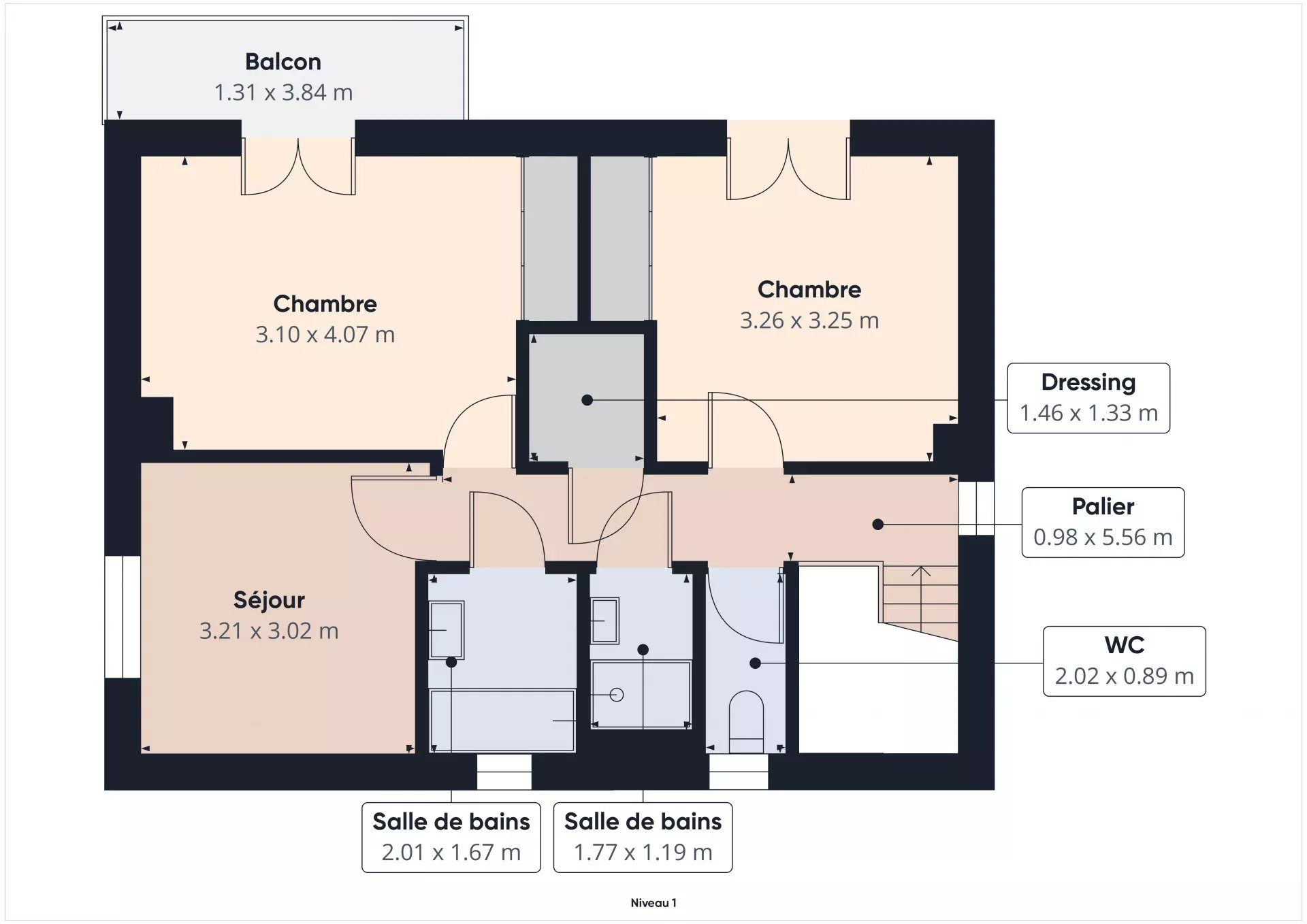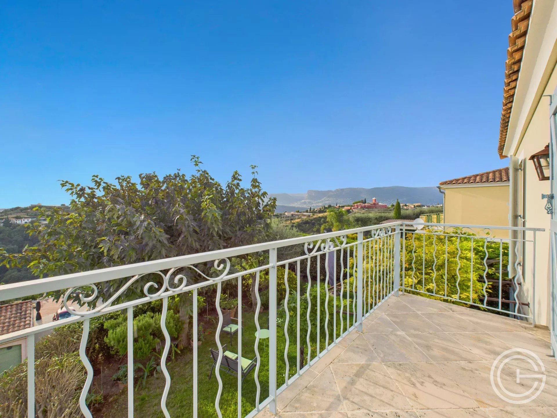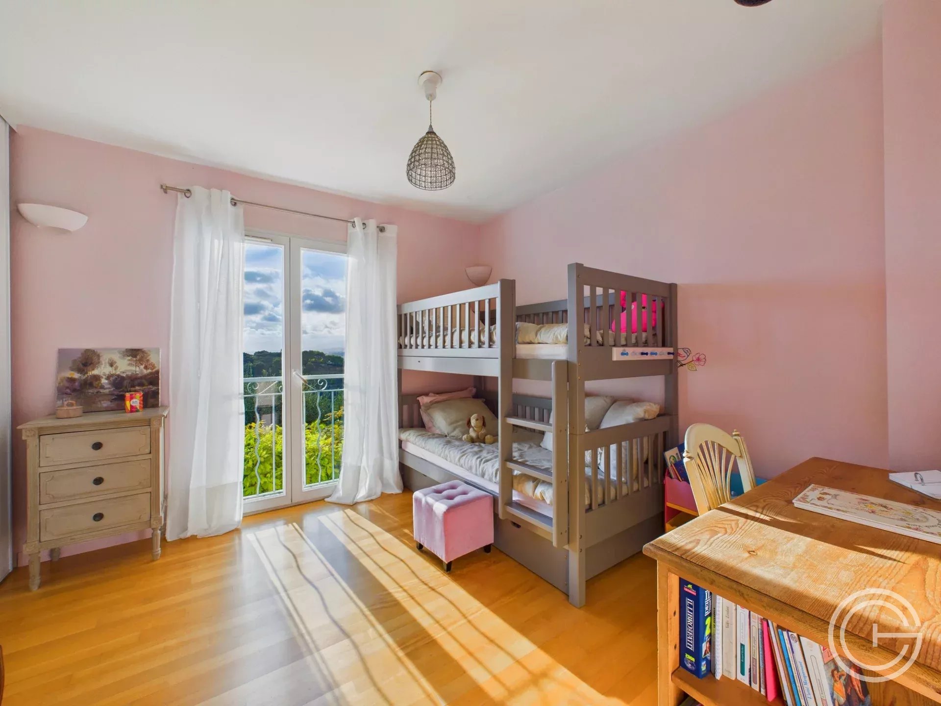 À l’étage : un couloir dessert trois belles chambres, dont une bénéficiant d’un balcon avec vue panoramique, ainsi que deux salles d’eau et un dressing.