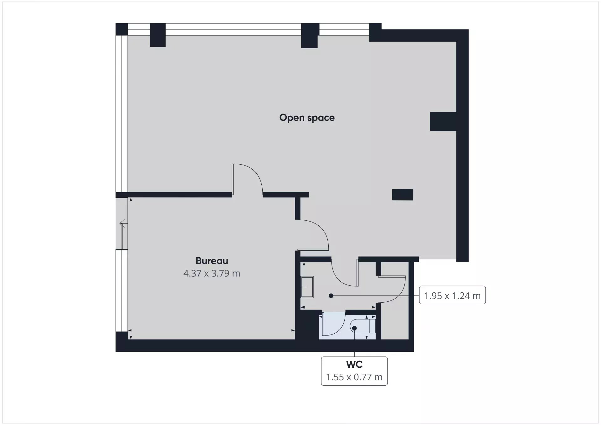 Il se compose comme suit : une entrée, un open space de 43m², un bureau fermé, un WC avec lave main.