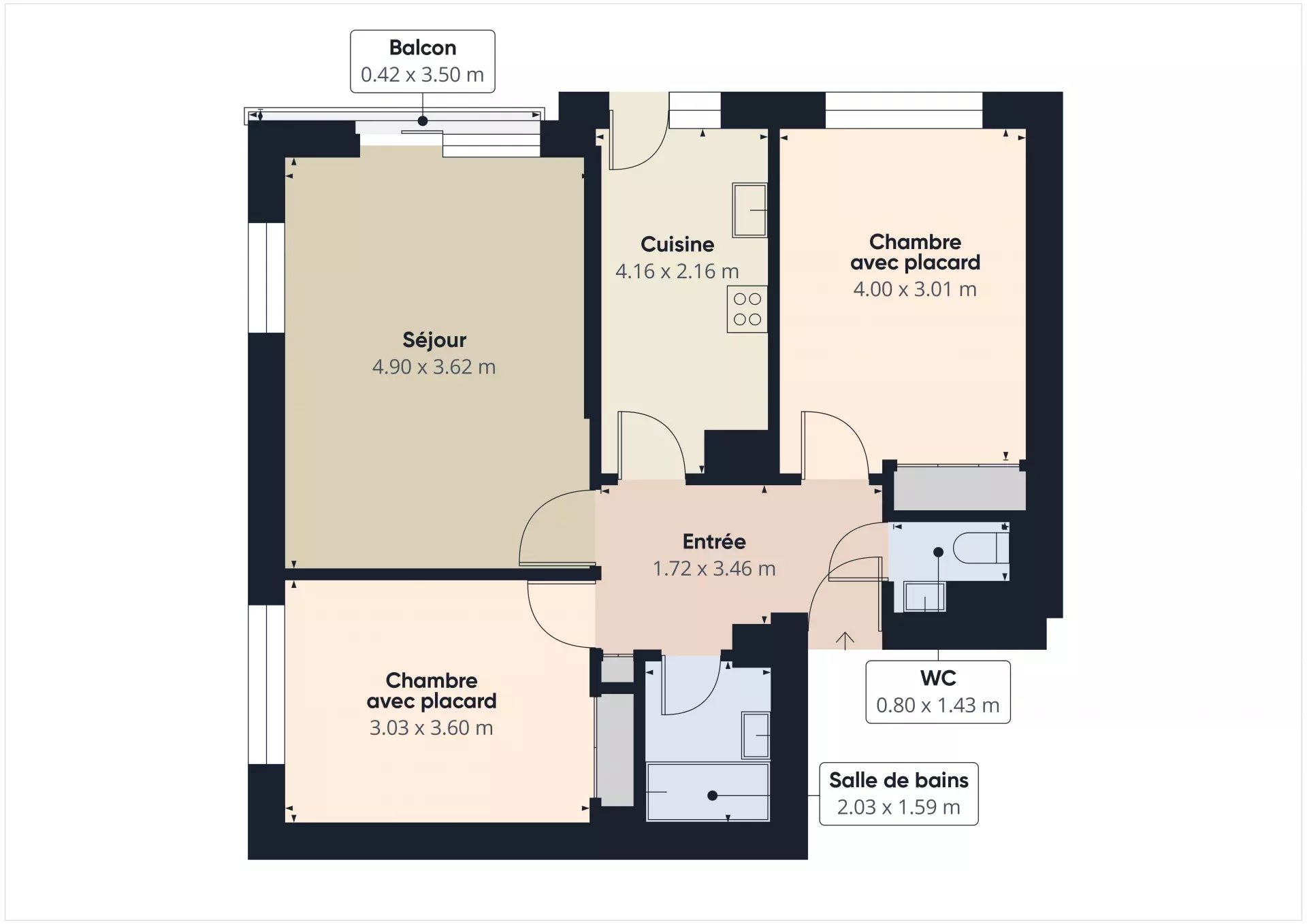 Entrée desservant toutes les pièces, séjour avec cuisine attenante, 2 chambres avec placards, salle de bains et WC séparée avec lave mains.