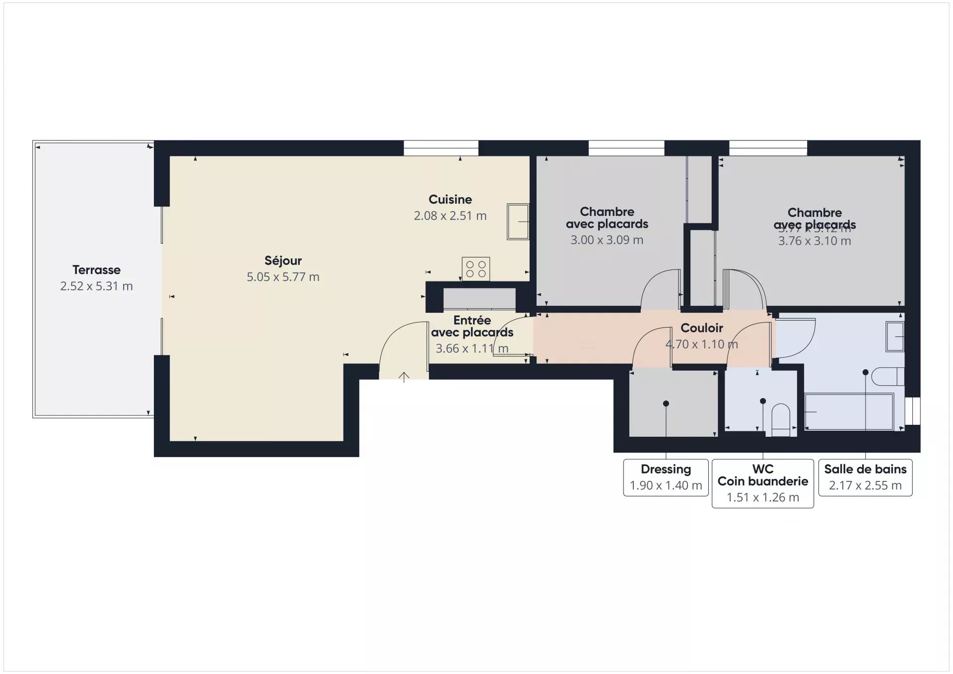 L'appartement est très bien agencé, il bénéficie d'un séjour/cuisine de 35 m² ouvrant sur une terrasse de 12m² exposition OUEST, couloir avec rangements, WC indépendant, dressing, 2 chambres avec placards et salle de bains.